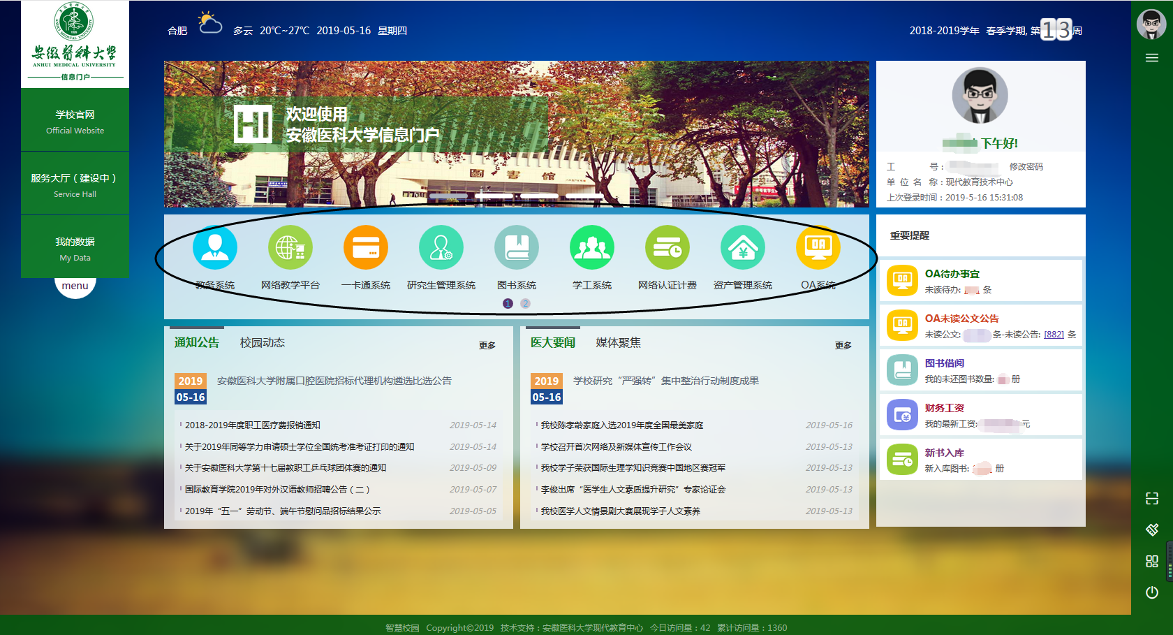 1、实现面向师生的统一的、一站式的服务界面,提供个性化的综合信息服务环境,实现信息集成、数据服务、待办提醒等功能。