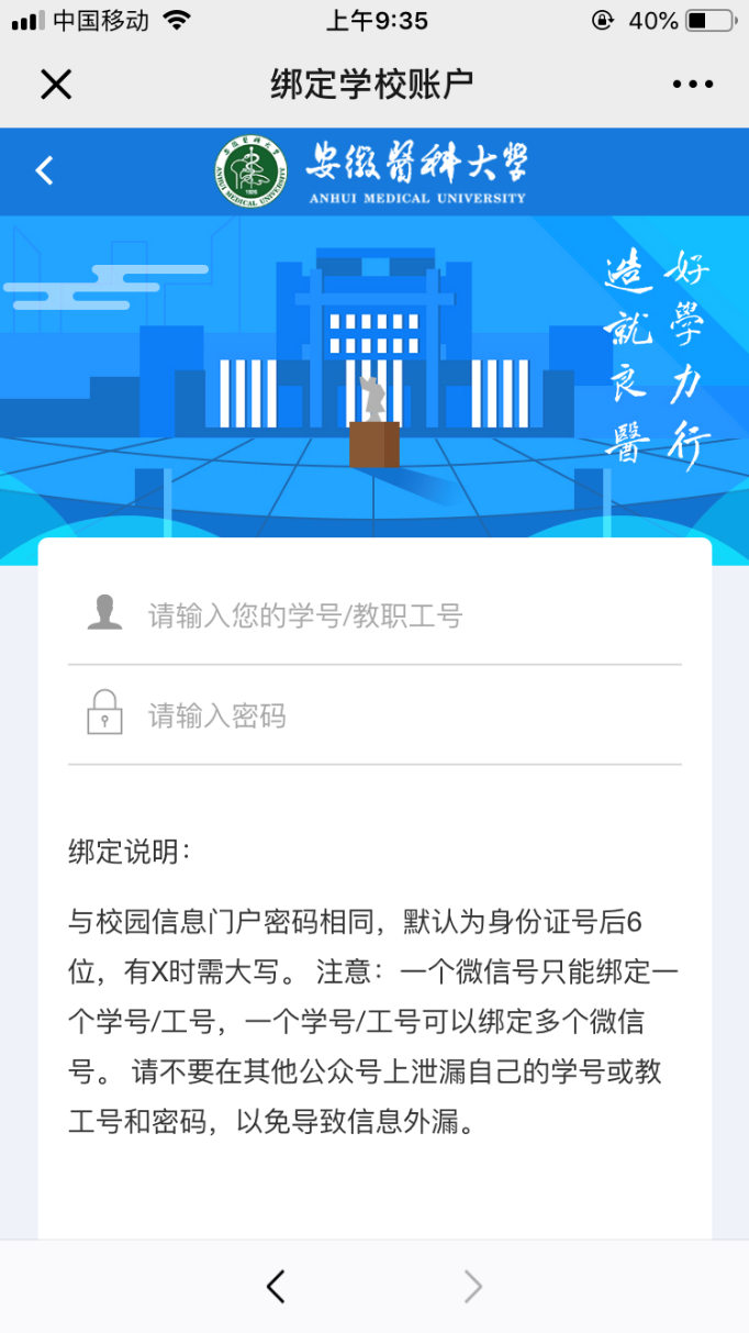 微服务模块首次访问需要进行帐号绑定,绑定后教师、学生可以访问各自的课表、一卡通、图书借阅情况等信息的查询。