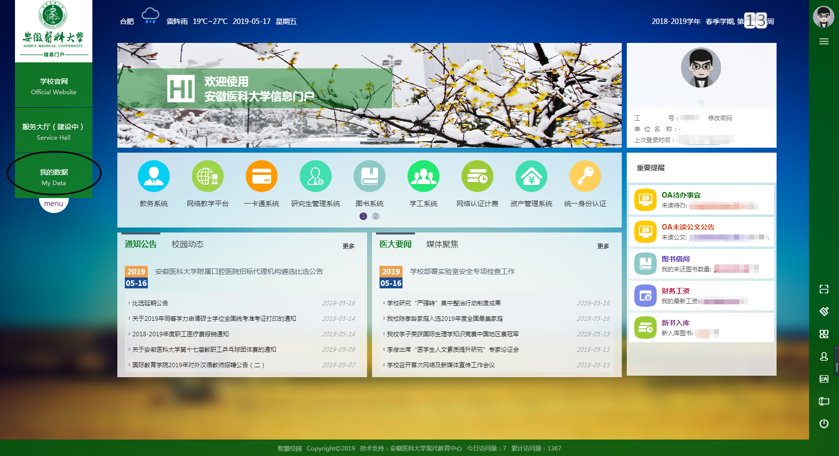 2、实现师生个人信息的查询:提供个人人事信息、校园一卡通信息、校园卡交易明细、教务信息、图书借阅信息、资产信息等多个主题的个人资料查询。师生登陆校园信息门户后,点击“我的数据”,进行查看,如下图:
