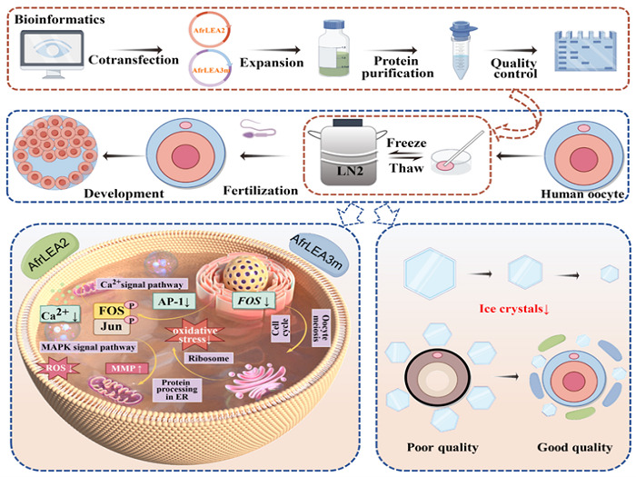 我校低温生物医学与组织工程团队的研究在对卤虫第三组LEA蛋白进行系统的结构功能分析基础上,完成了AfrLEA2和AfrLEA3m基因的合成并亚克隆至表达载体,建立了AfrLEA2和AfrLEA3m蛋白的表达纯化体系,获得目标蛋白;研究了AfrLEA2和AfrLEA3m蛋白在低温保存过程中对卵母细胞形态、线粒体功能、冰重结晶抑制(IRI)水平以及发育能力的作用;发现了AfrLEA2和AfrLEA3m蛋白在卵母细胞低温保存中的最佳作用浓度,全面开展了高通量测序转录组分析研究。研究还揭示了AfrLEA2和AfrLEA3m蛋白可以通过抑制FOS基因表达同时,减少氧化应激相关通路作用,发挥其在人卵母细胞低温保存过程中的保护作用。