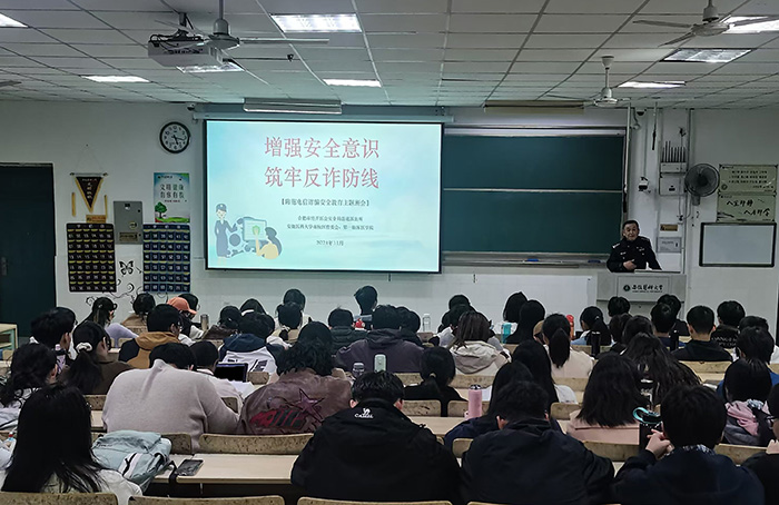 作为反诈防诈的重要抓手,南校区管委会邀请警务站民警,以专业、年级、班级为单位,为各学院开展反诈讲座和主题班会。治安第一线的民警结合现实案例分析,再现诈骗高发的刷单兼职诈骗、虚假交易网站诈骗、冒充熟人诈骗、买卖游戏账号诈骗、网络购物诈骗等诈骗伎俩与诈骗情境,展示诈骗手段和形式的多样化,通过与学生互动交流,释疑解惑,提醒大家提高警惕、拒诈防骗。