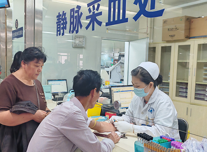 该院静脉采血窗口工作人员有条不紊地为患者采血。 陈媛媛/摄